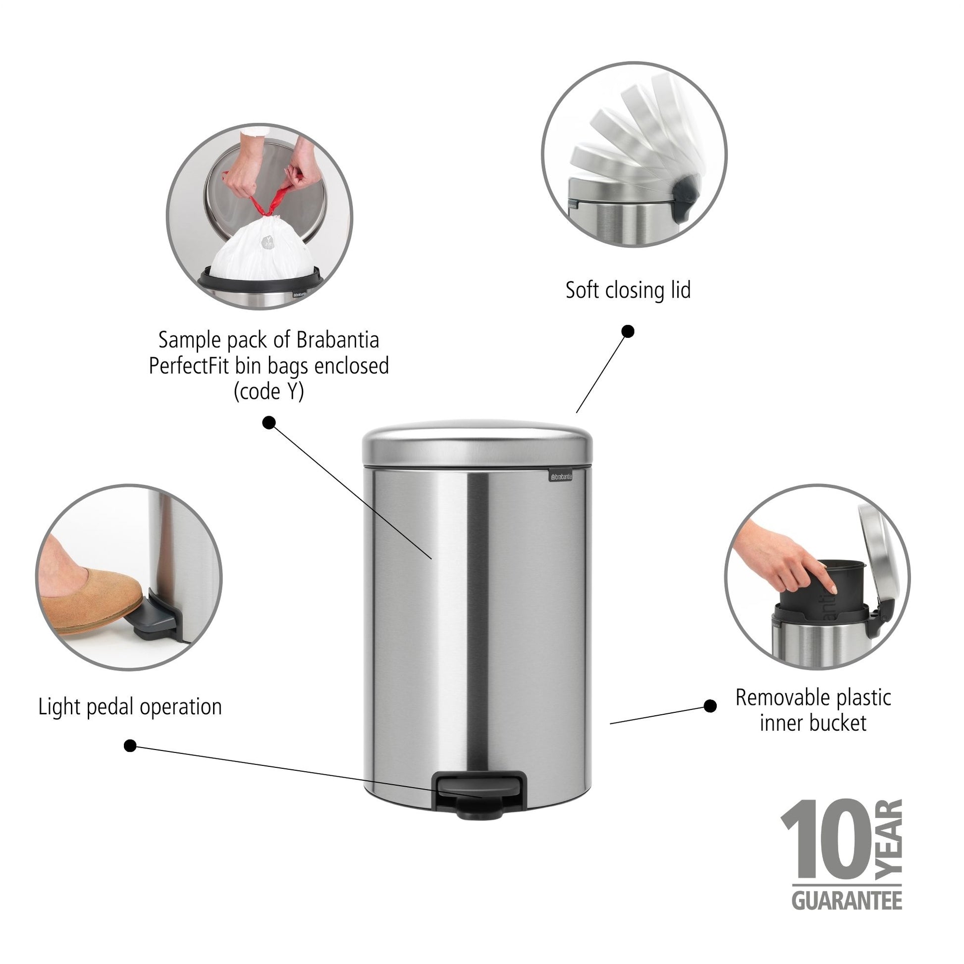 • Sample pack of Brabantia PerfectFit Bags enclosed (code Y) – easy to fit without ugly overwrap.