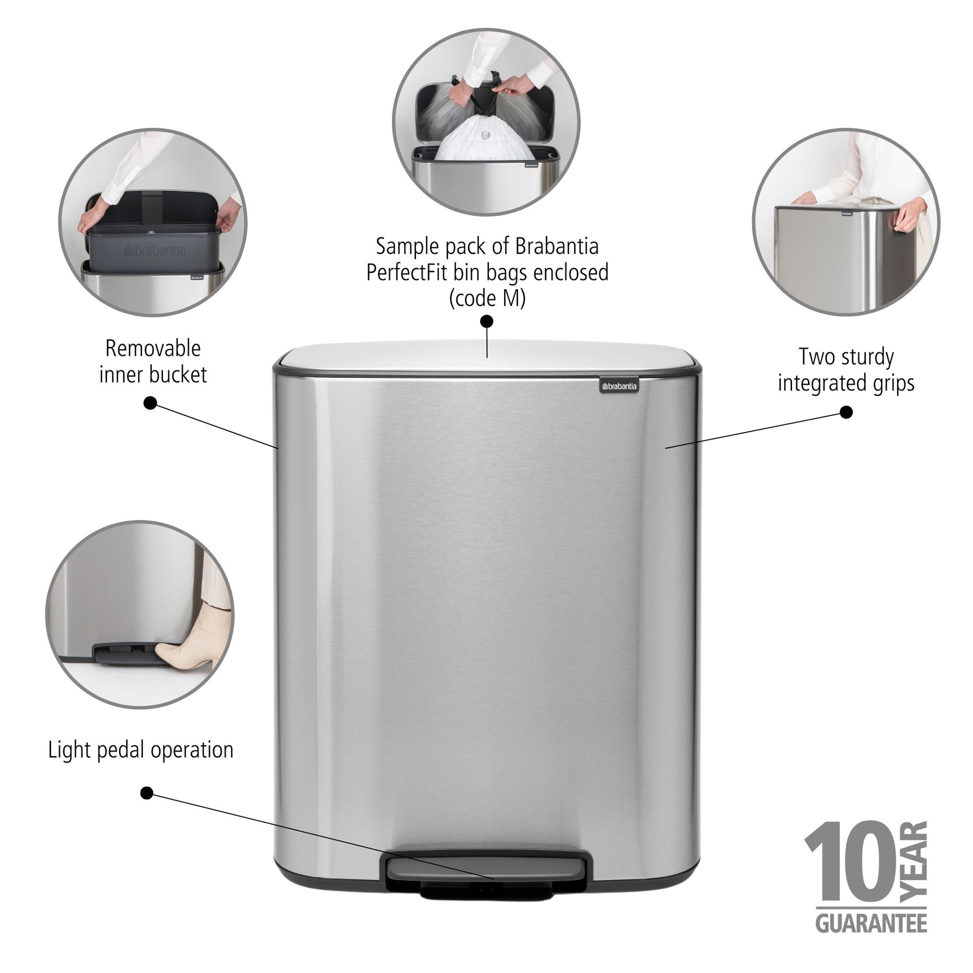 - Sample pack of Brabantia PerfectFit Bags enclosed (code M) – easy to fit without ugly overwrap.