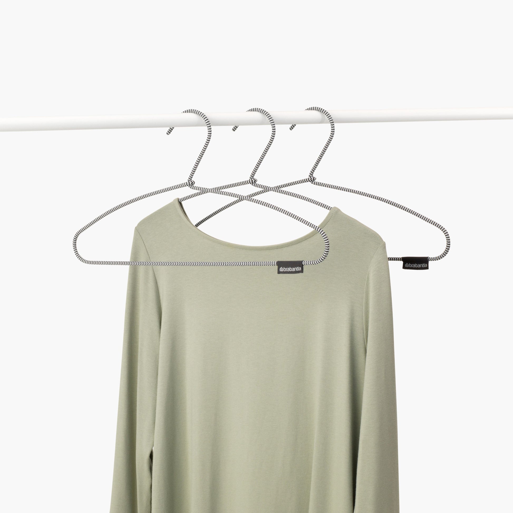 Add a touch of design to your freshly ironed clothes with Brabantia Soft Touch Clothes Hangers. This set of three colourful clothes hangers with non-skid fabric coating will go great with any outfit. You’ll be hooked!