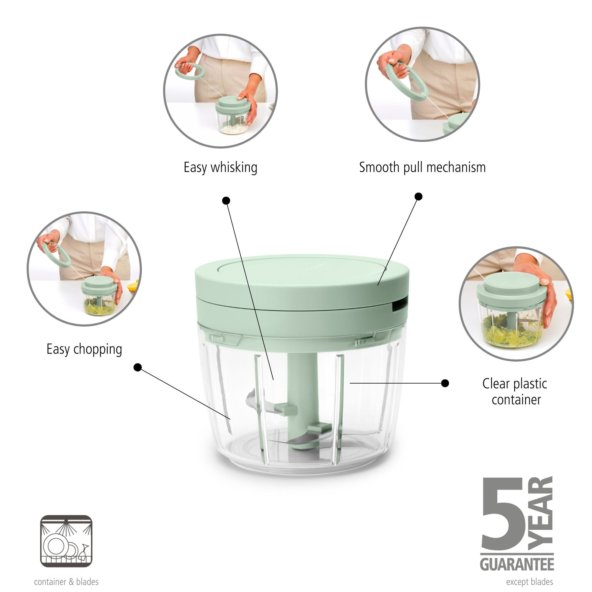 This easy-to-use Chopper has three sharp stainless-steel blades that rotate when you pull the ring and easily cut through even the toughest foods. This handy kitchen helper even has a whisking disk for whisking cream, mixing sauces or beating eggs in a jiffy.
