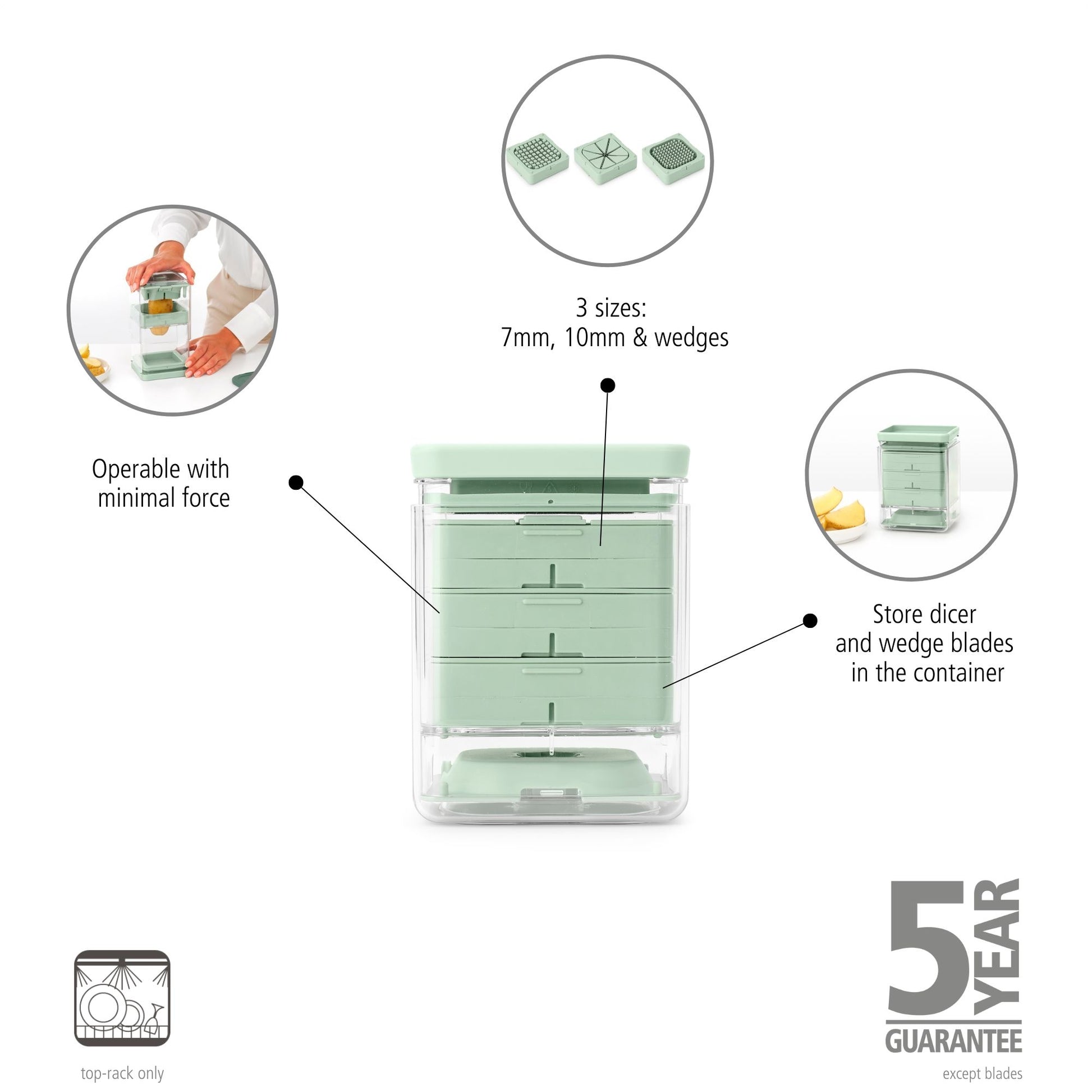 Say goodbye to uneven dicing and push for perfectly cut potatoes, courgette, cucumbers, and more. The Brabantia Tasty+ Potato Cutter is a magic box with blades for dicing in two sizes and for wedges. Install the blade you want, put your potato or veg on top and push to slice or dice.