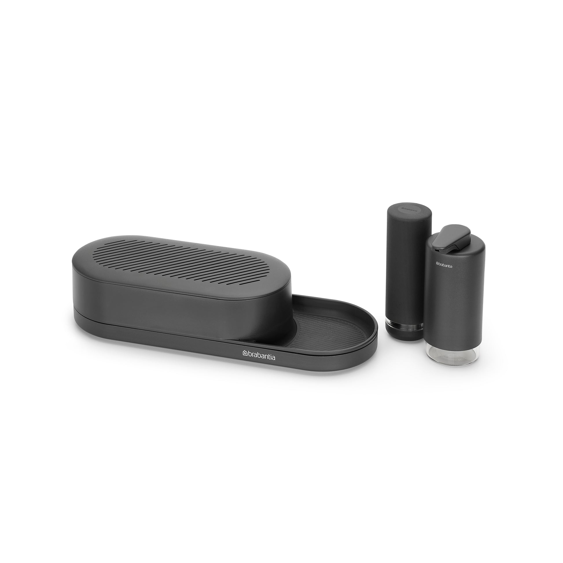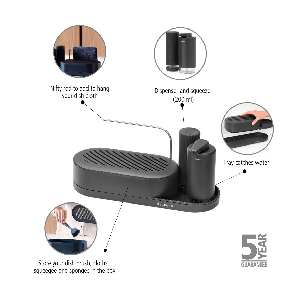 - All organised – set with soap dispenser, soap squeezer and organiser, ideal for storage and drying, hand soap and dishwashing liquid.