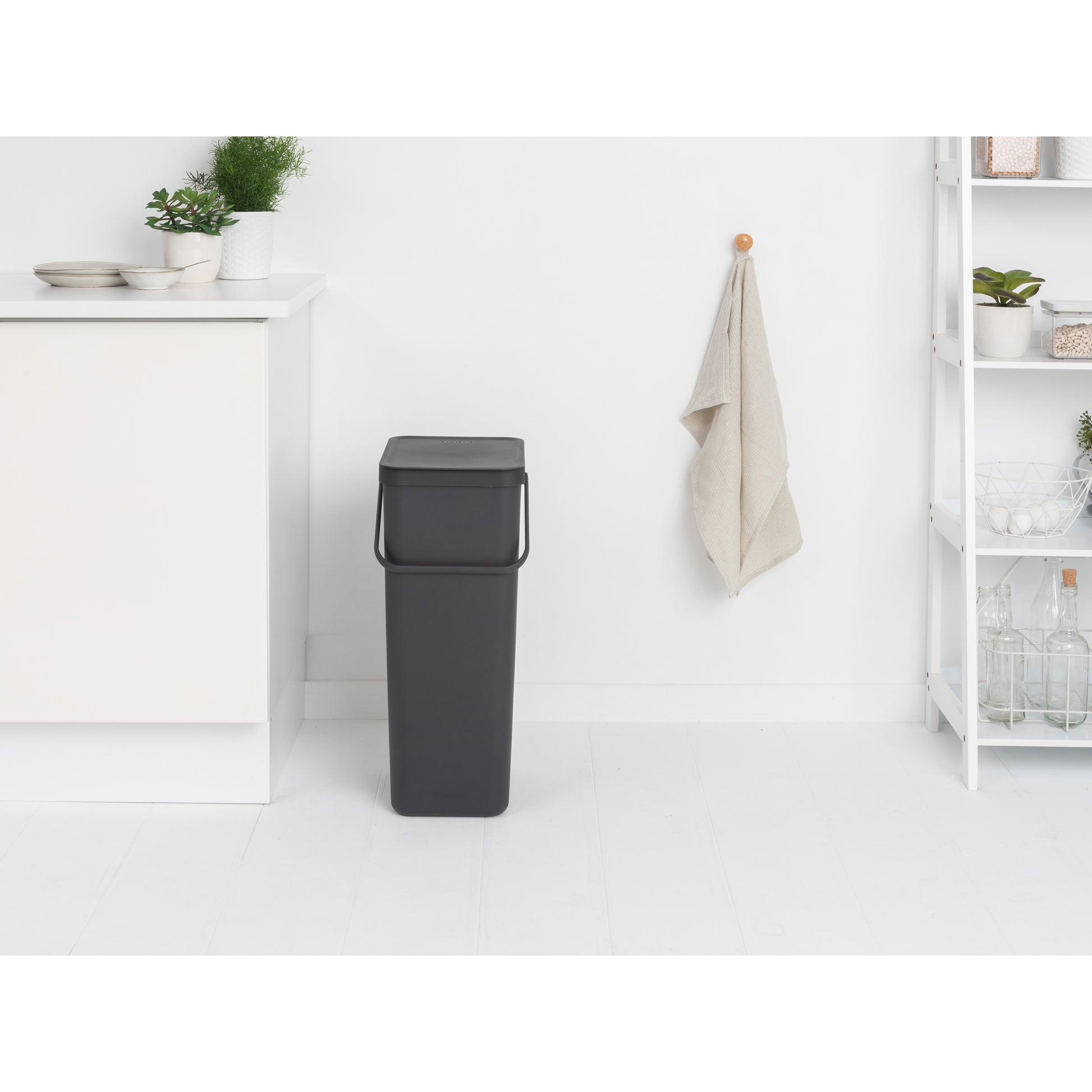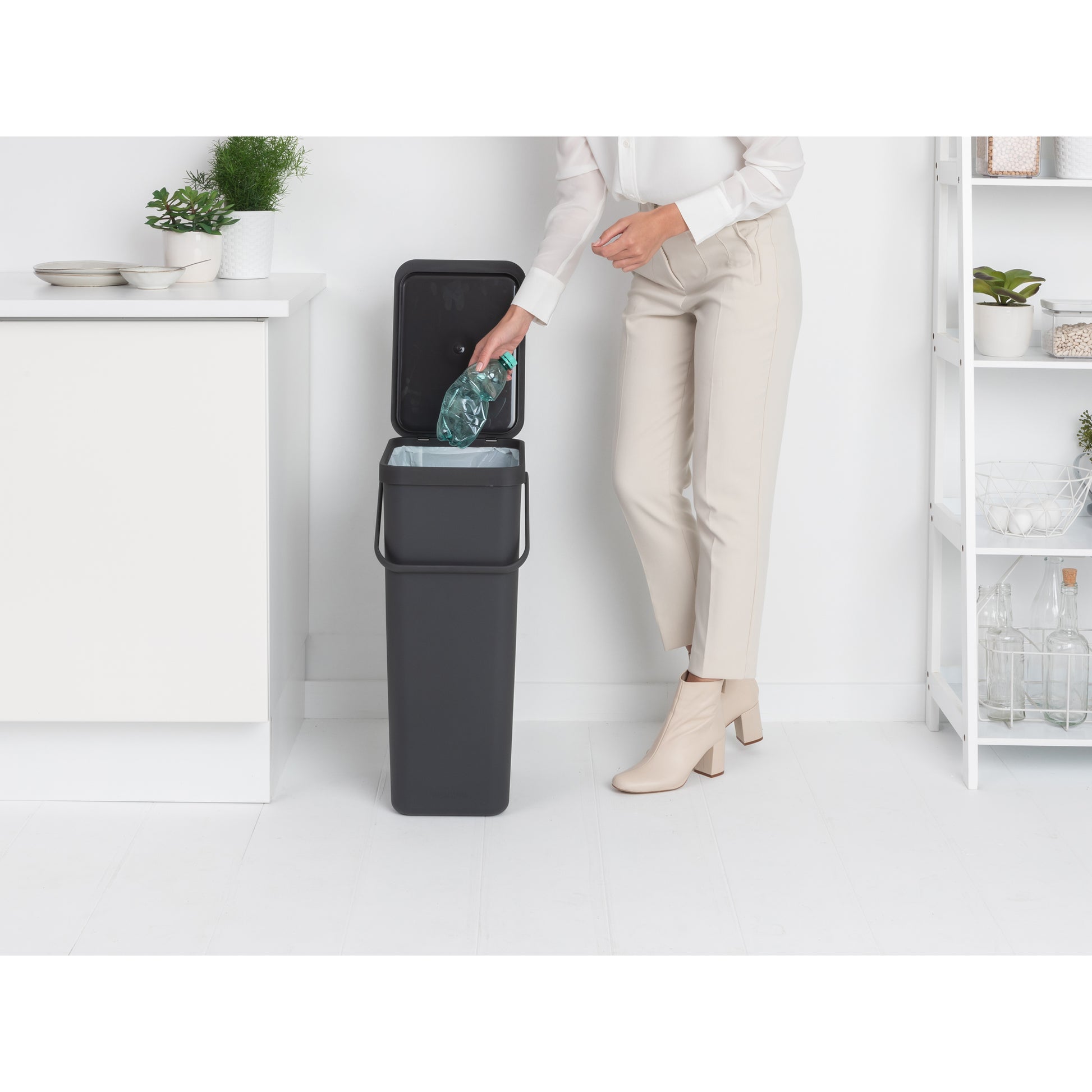 Feed your empty packaging, bottles, cans - and anything else you want sorted - to this handy 40 litre Brabantia Sort & Go Recycle Bin. It fits snugly in corners, flat against the wall, and has a large handle for easy carrying and emptying. Just what you need for a smooth running recycling operation at home!