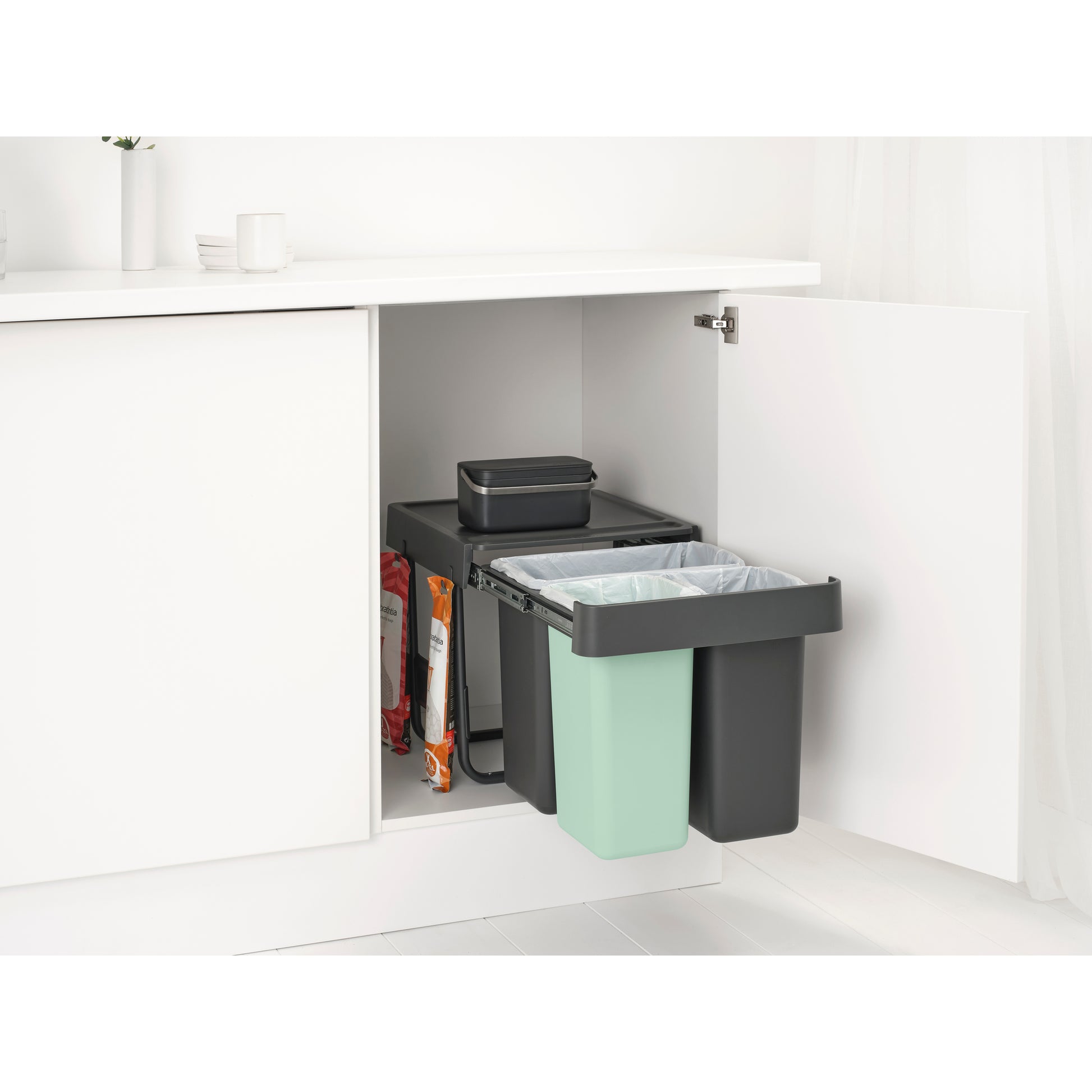 Triple your waste-separating power, without losing any floor space with the Brabantia Sort & Go Built-in Bin 10+10+20 litre. Made to hide in the cupboard, with an easy to install mounting frame (self-supporting, so no sagging doors!). These discreet bins fit in most kitchen cupboards, whether the doors open to the left or right. They even have storage space on top and hooks on the side for extra organising. With a long telescopic rail, so you can single-handedly pull them out all the way. And of course they are easy to clean, take out and empty too. A great set.