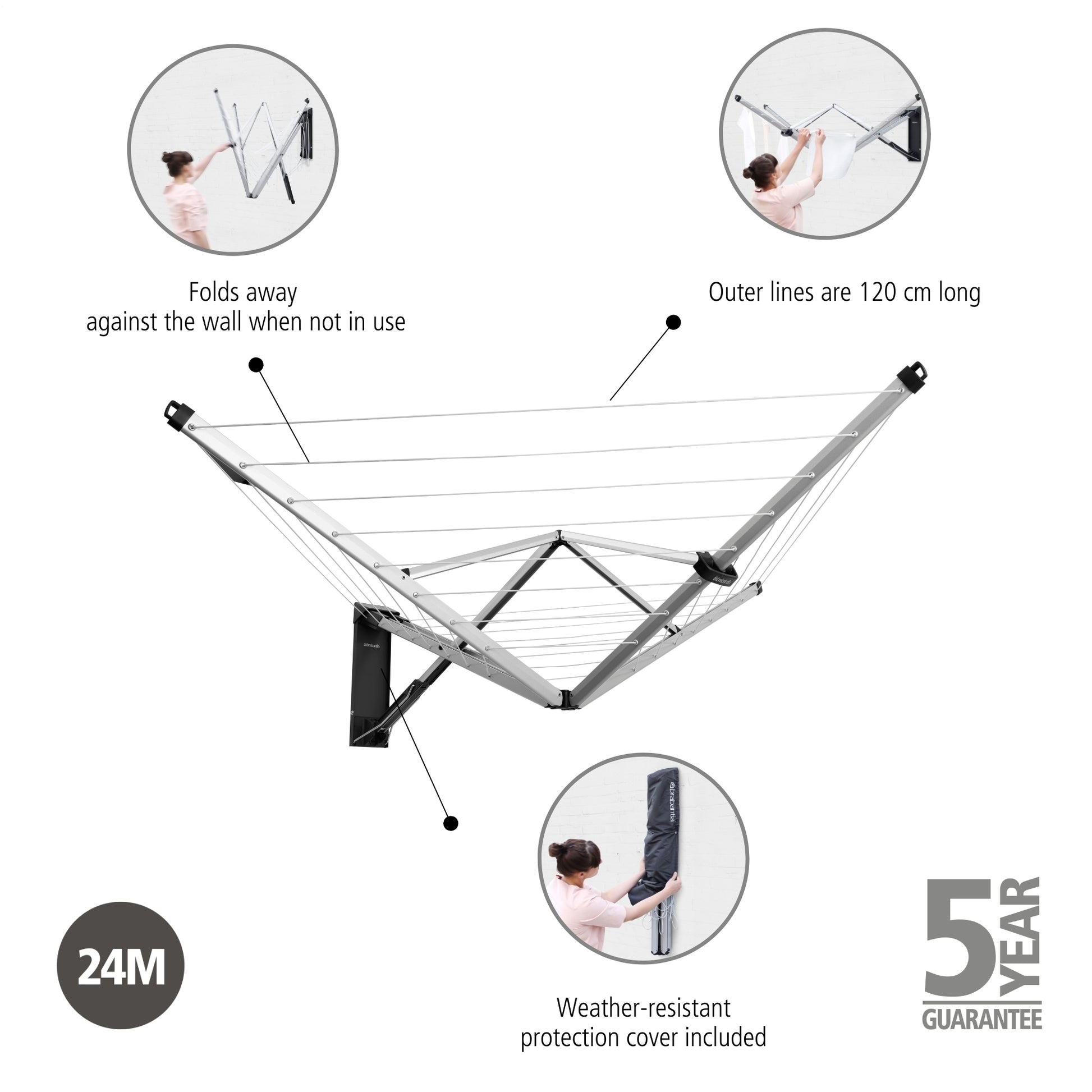 This compact Wallfix dryer will fit into a small space and can be mounted on any suitable wall even in a small area and is always ready for use. It can be simply folded away when not in use into a space saving unit. It comes standard with a protective cover which means if used on a balcony or patio it still looks stylish when not in use.