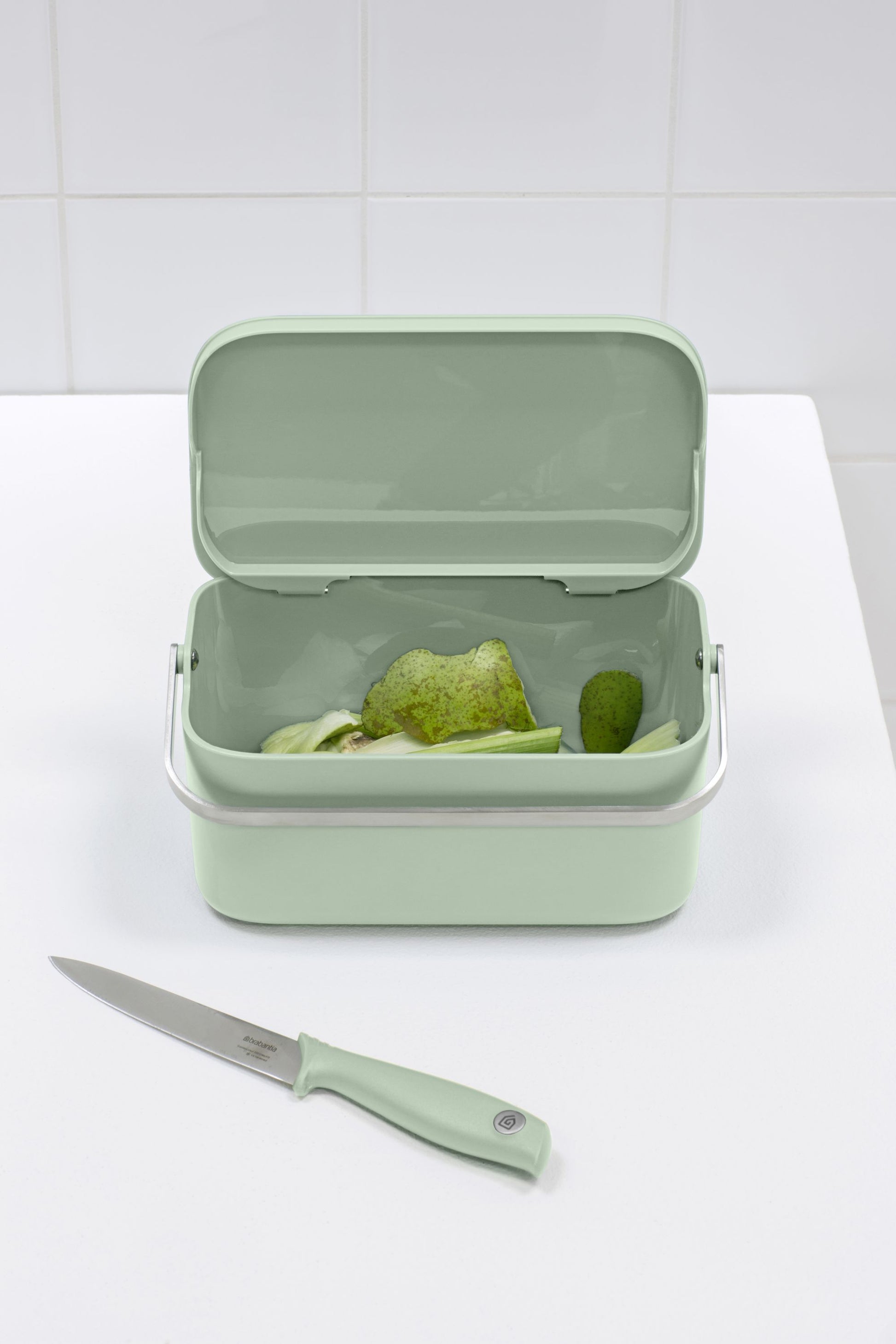 Keep your countertop clean when cooking, with this cute Brabantia SinkSide Food Waste Caddy of 1.8L. It has a stay open lid - very easy for larger chores. Its large stainless steel handle makes it easy to carry your leftovers to your compost bin and to empty it. And when emptied, just put it in the dishwasher for cleaning. Surely no baddy, this caddy!
