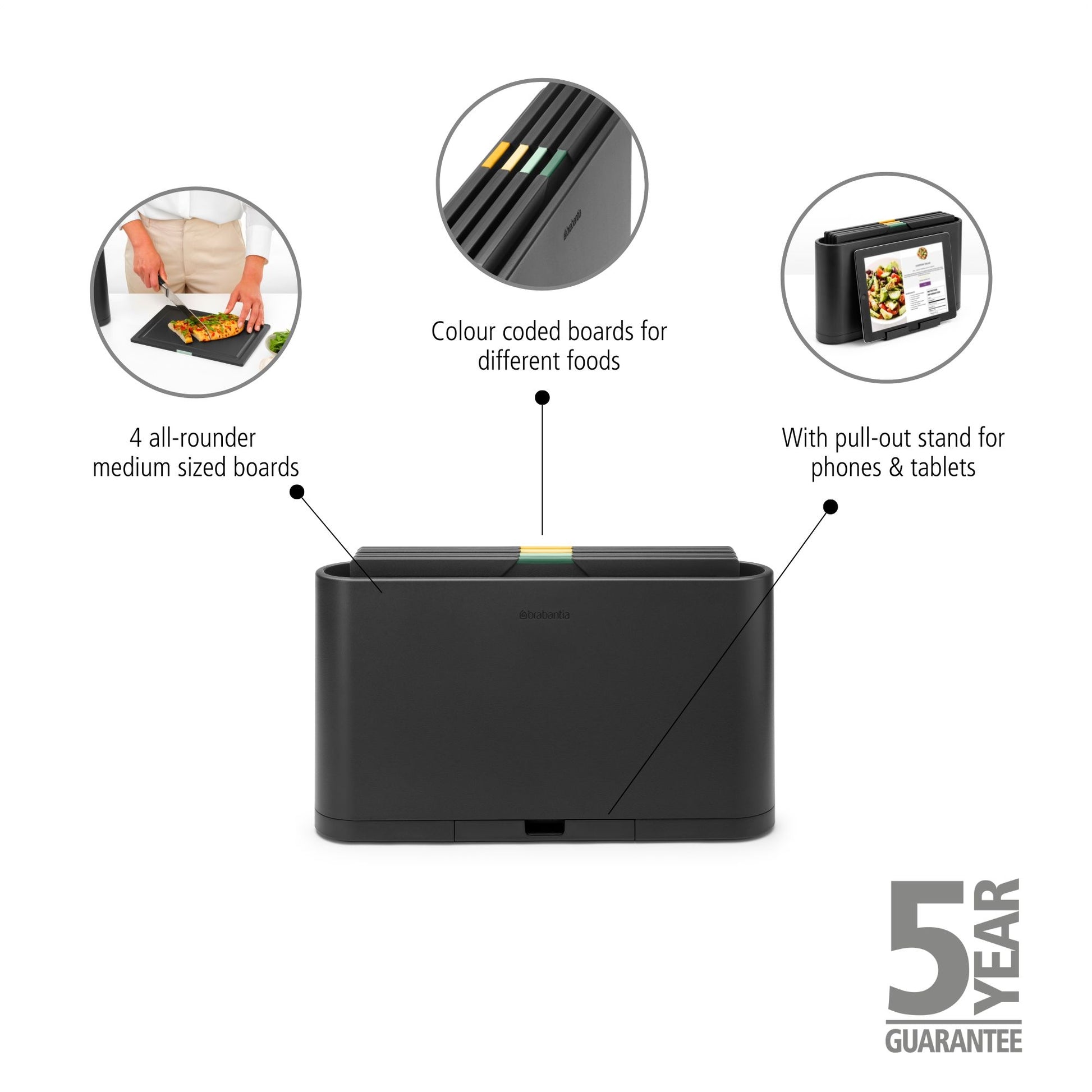 This set of four Brabantia Tasty+ Chopping Boards is all you need in your kitchen when it comes to cutting and organising. The double sided chopping boards are colour coded, so no more mixed use of your chopping boards or cross-contamination. The sleek storage case hides your boards and has a pull-out tablet stand, so you don't miss a step in your recipe. All aboard!