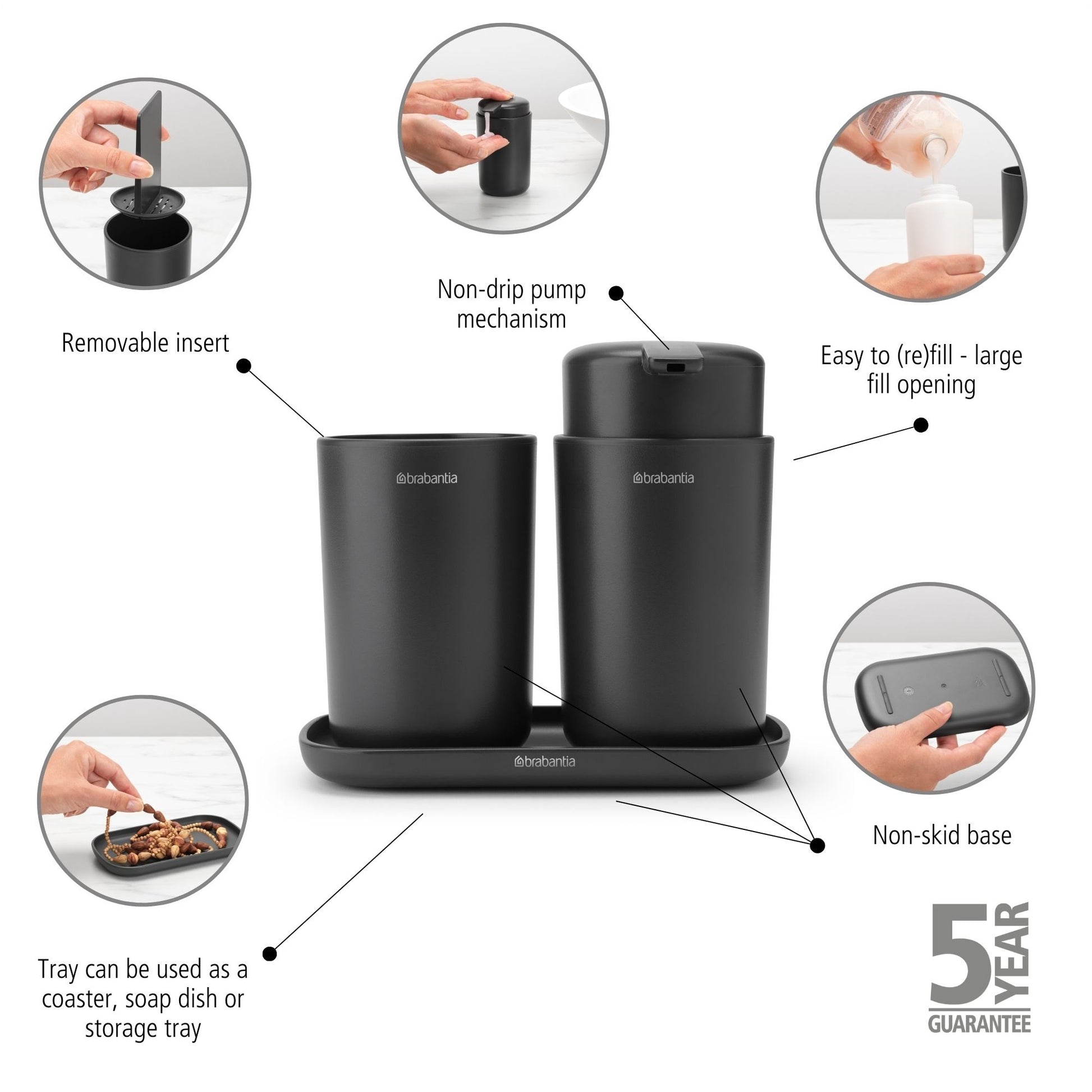 - Hands-on bathroom set - stylish trio consisting of a soap dispenser, toothbrush holder and a tray.