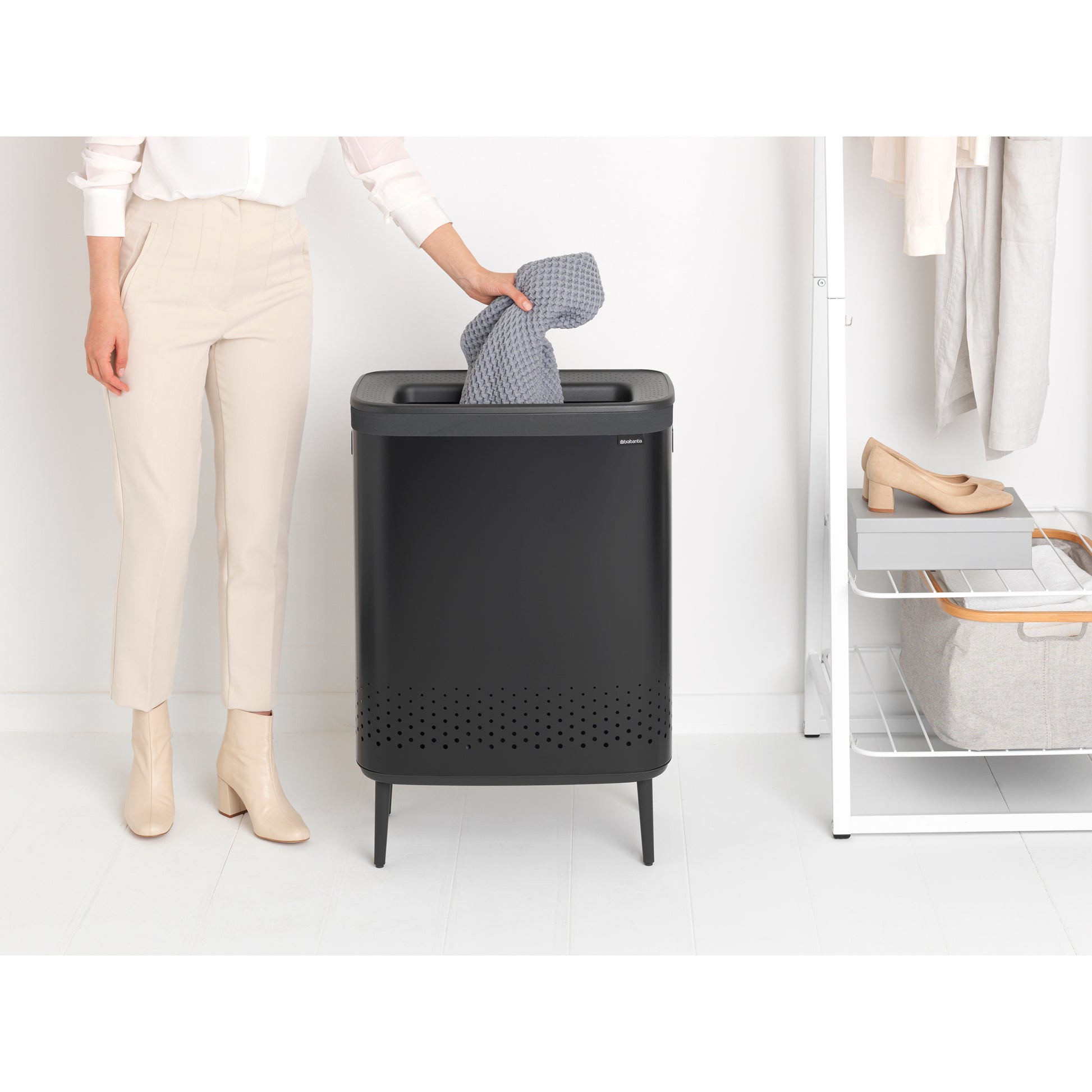 Brabantia makes laundry day a fashionable event, with the 2x45 litre Bo Laundry Bin Hi. The cabinet-like design makes it a great decoration piece in the bedroom or bathroom. But there’s more to this laundry bin than lovely looks! Like its perfect height, smart ventilation holes and the two-compartment laundry bag inside for sorting laundry at the source. The nifty lid has a clever Quick-drop opening, significantly increasing the chance that the clothes of your family members actually end up in this laundry bin. The lid can be put upright too. On washdays, take it off to simply remove the perfectly fitting laundry bag inside and transport the load to your washing machine with the same ease. Sorted!