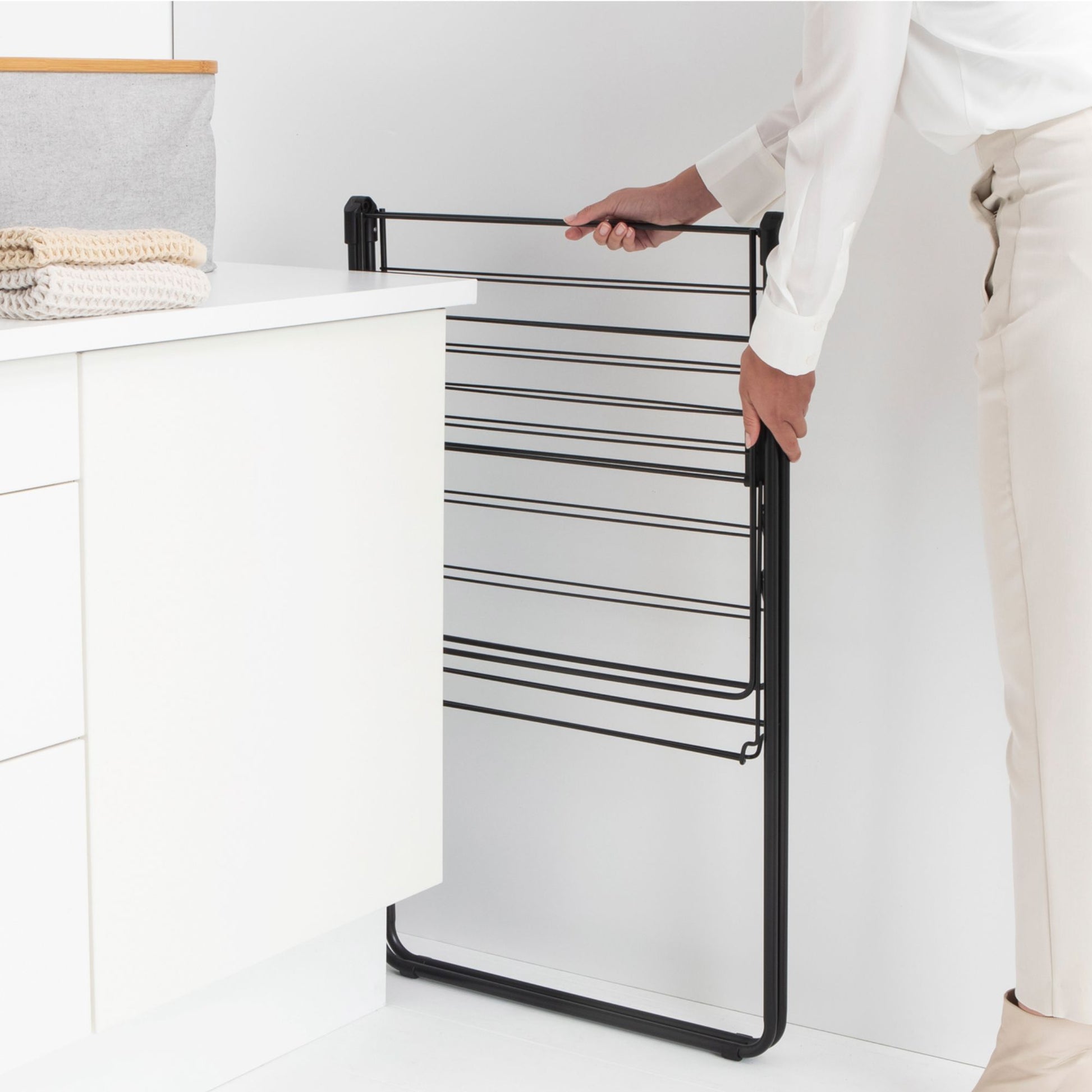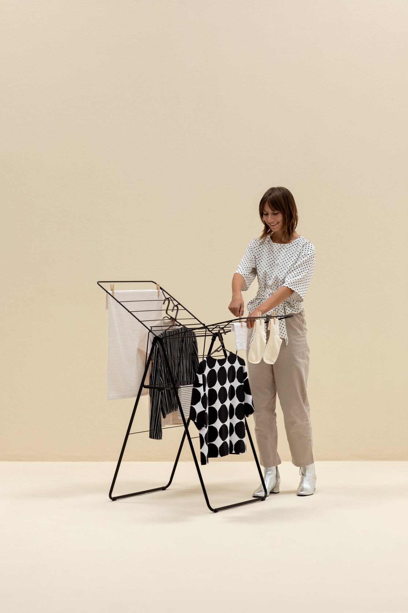 Save time and energy by drying your laundry naturally - and save space by hanging them on this smart rack! With this HangOn Drying Rack, with 15 metres of flexible drying space and room for 4 extra clothes hangers, you can dry your hanging trousers or flat drying delicate pieces anywhere in the house. And when all’s dried and done, fold it flat easily for compact storage. Lots of drying space for even the smallest home!