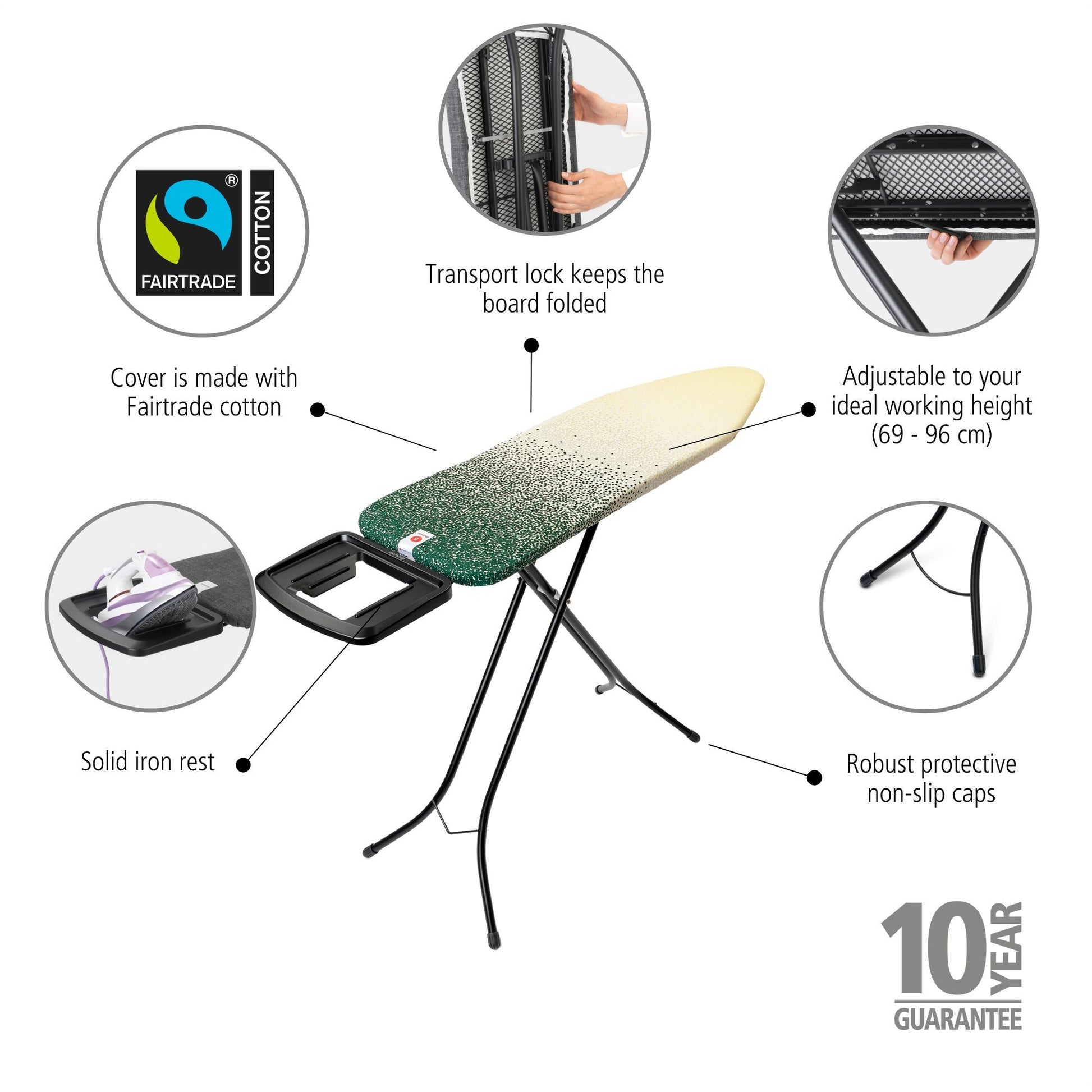 This Brabantia Ironing Board B with solid steam iron rest has all you want in an ironing board. Like an unbleached cover made with 100% Fairtrade Cotton. And of course, this much-loved board is sturdy, stable and designed for easy ironing with all irons. A hot item!