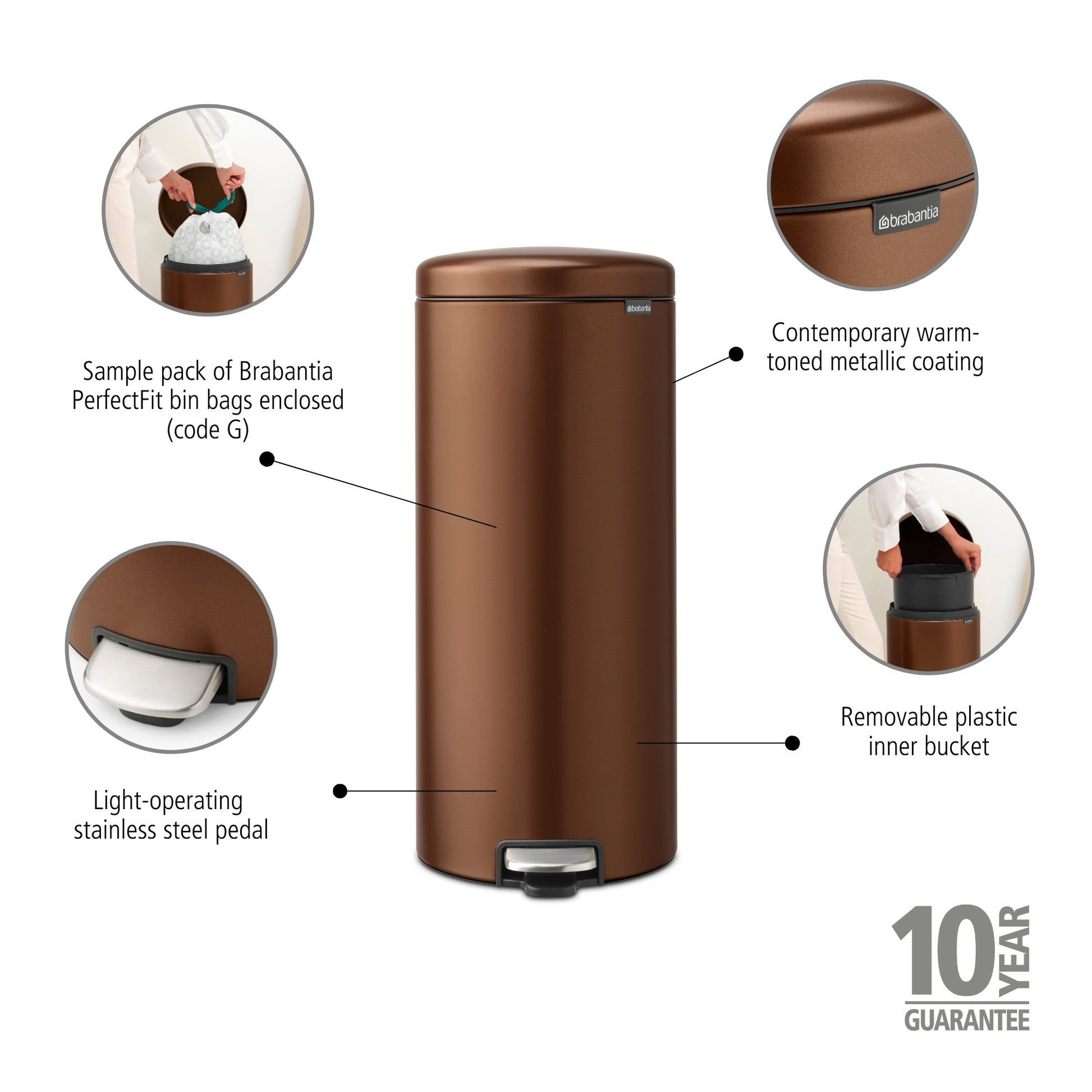 - Sense of luxury - contemporary warm-toned metallic coating and stainless steel pedal.