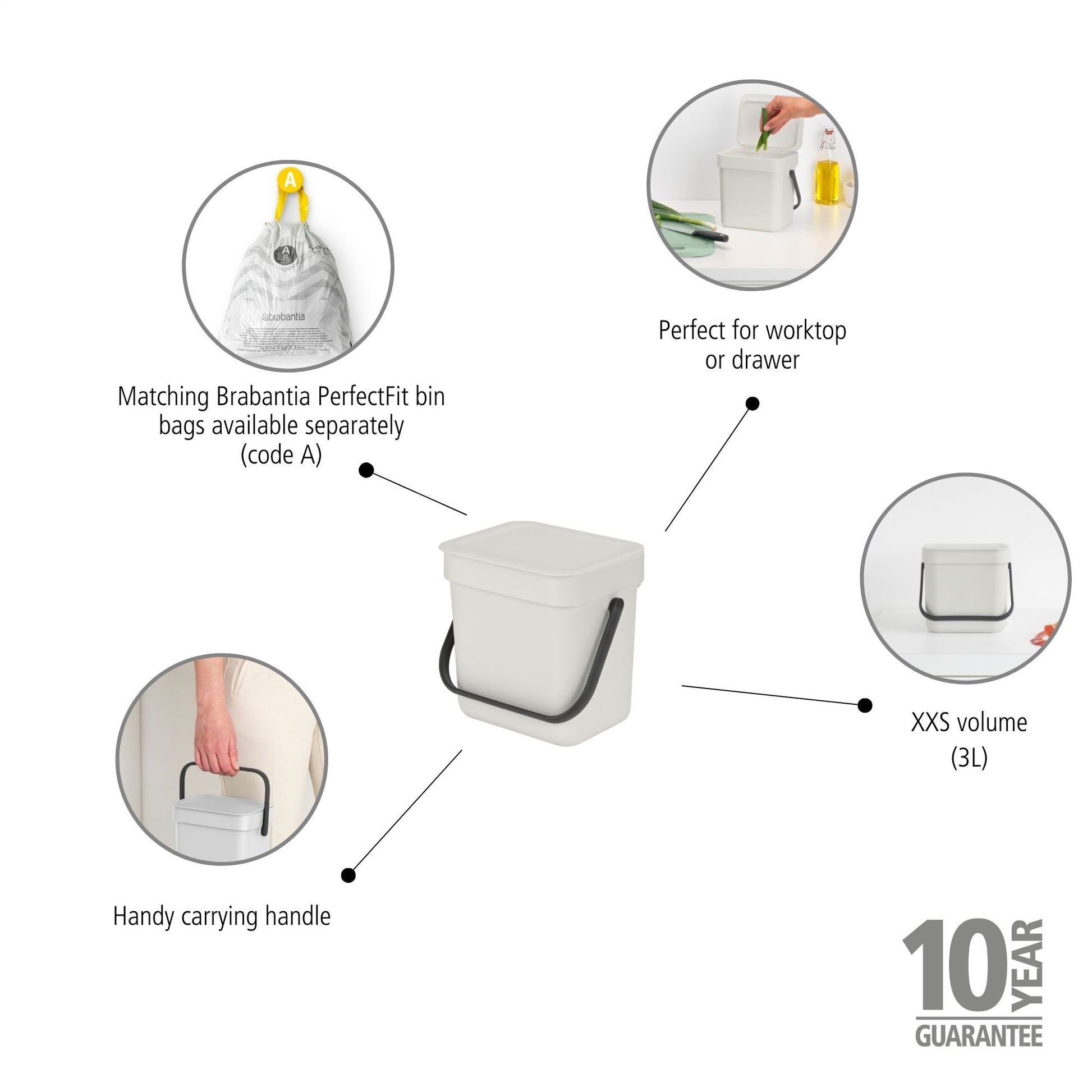 This cute 3 litre Brabantia Sort & Go Recycle Bin with stay-open lid is great for peels, scraps, leftovers... all organic kitchen-waste actually. Just display it on your worktop or hide it in a drawer. Full? Grab it by its handy handle and empty it on your compost heap or in your organic waste container. A great bin in XXS size!
